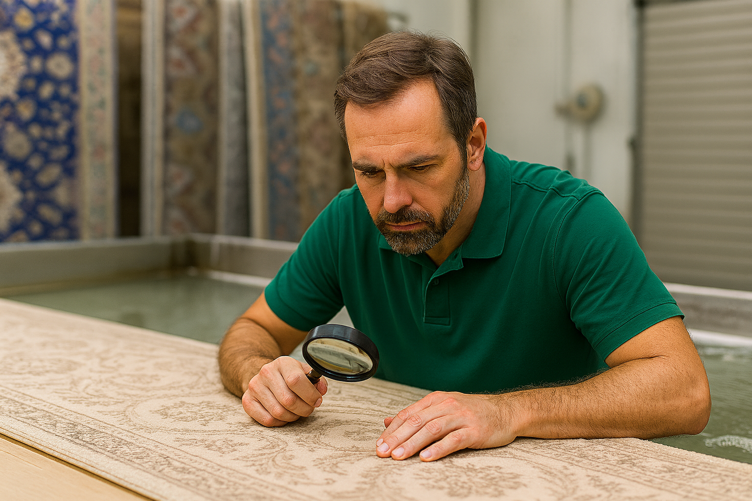 Ковер принимают в цеху, осматривают на наличие пятен, повреждений и особенностей ткани. Это помогает выбрать оптимальную технологию стирки.